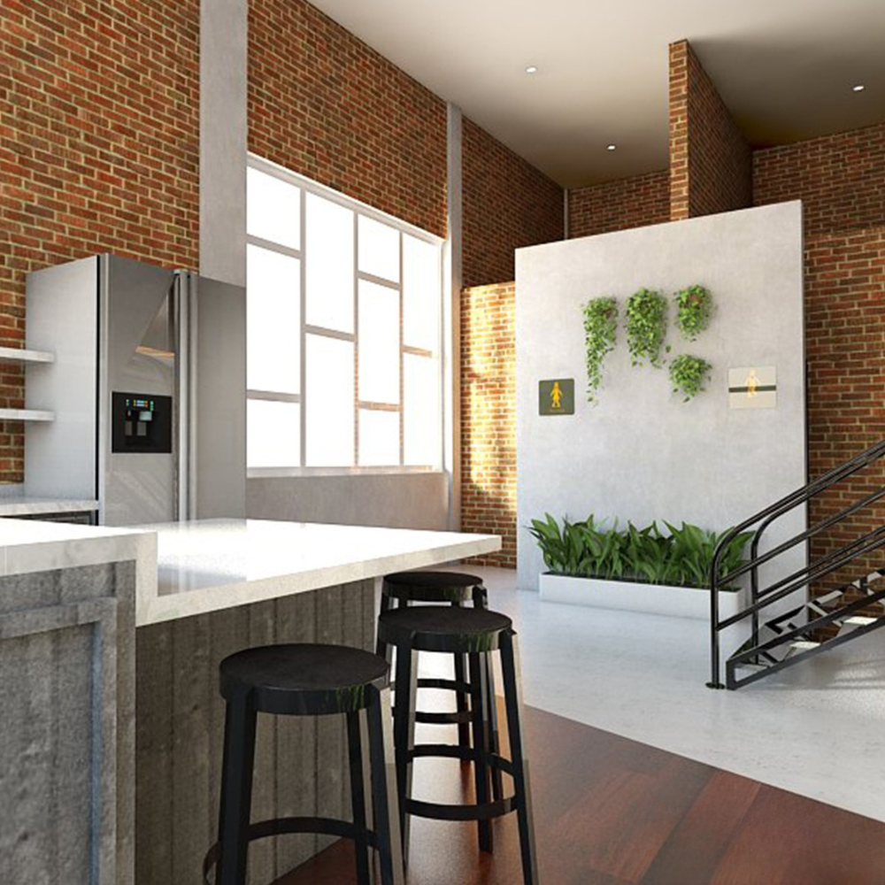 Ruang kerja utama dirancang dengan gaya industrial modern: perpaduan antara dinding bata ekspos, rangka baja hitam, dan langit-langit terbuka.