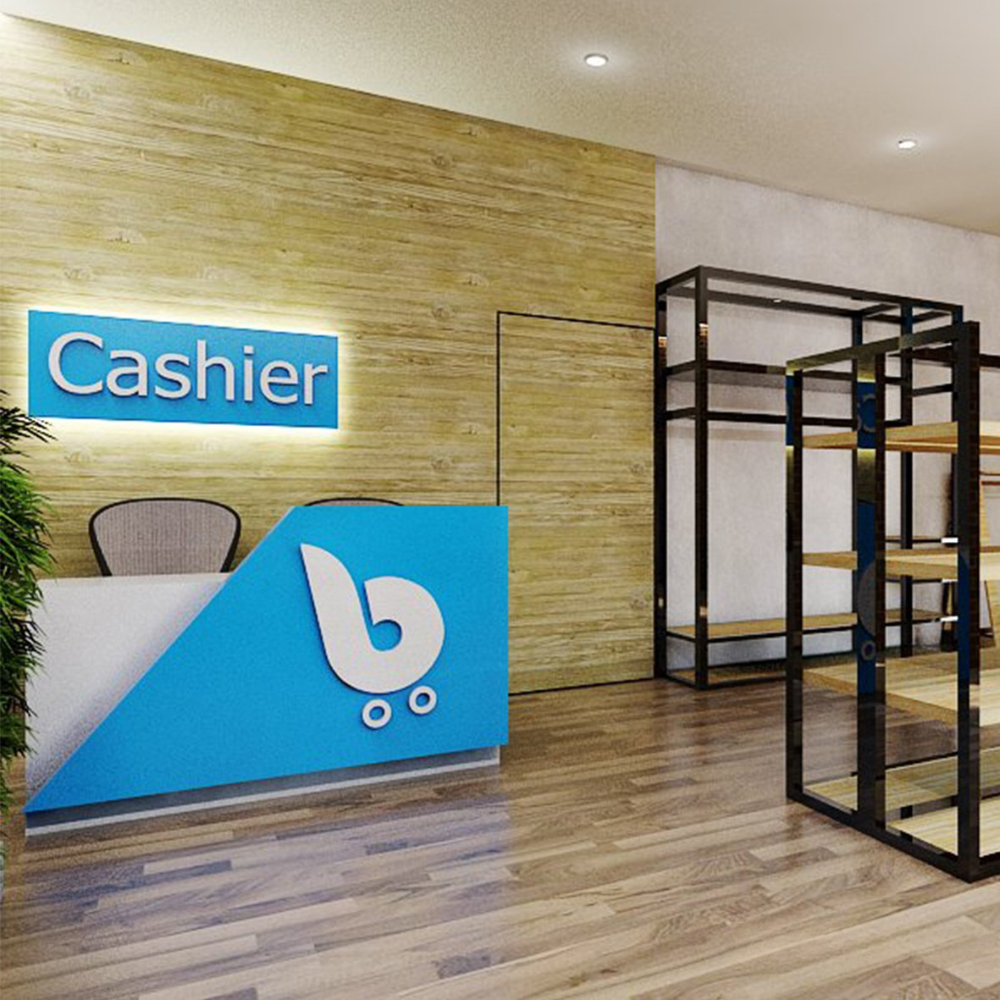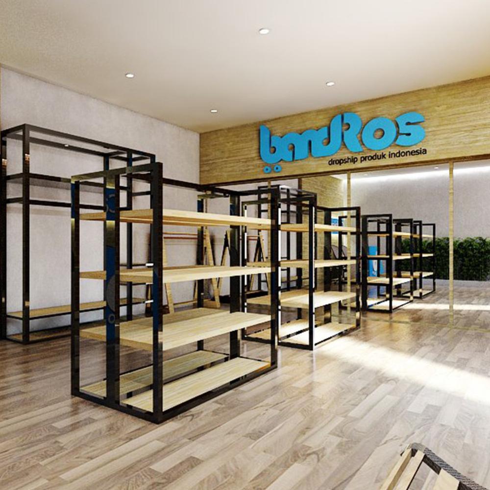 Rak-rak logam dan kayu dirancang modular dan fleksibel, memudahkan pengaturan produk.