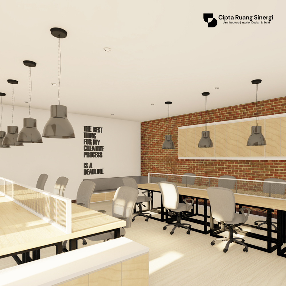 Ruang kerja didesain terbuka dengan konsep open space yang mendorong kolaborasi antar tim. Penempatan meja panjang dengan kursi ergonomis mendukung aktivitas kerja yang dinamis serta menciptakan kesan luas dan terorganisir. Area kerja juga dilengkapi dengan elemen partisi rendah dari logam untuk menjaga privasi visual tanpa menghilangkan keterbukaan ruang.