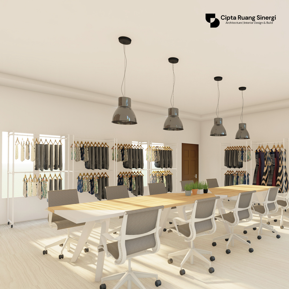 Pada beberapa sisi ruang, terdapat area display pakaian yang tertata rapi di rak gantung putih, mencerminkan fungsi showroom mini yang terintegrasi dengan ruang kerja. Area ini juga dilengkapi dengan papan presentasi, membuatnya multifungsi untuk keperluan pitching ide atau diskusi tim.